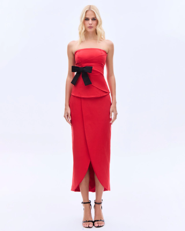 CONJUNTO KAROLINE: O conjunto Karoline é perfeito para quem deseja um look alinhado, elegante e moderno. Confeccionado todo em uma alfaiataria mais natural, a blusa possui um laço lateral e o trabalho dos drapeados transpassados dando um toque diferente e elegante à peça, além de zíper destacável para fechamento. Já a saia possui detalhe transpassado com barra arredondada, comprimento midi, toda forrada e com zíper de metal nas costas para fechamento.