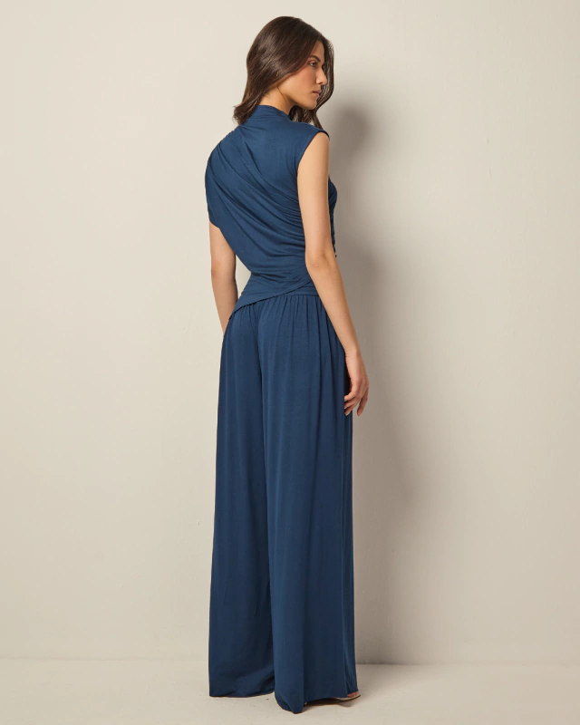 CONJUNTO LISSA: O conjunto Lissa é aquele look elegante e confortável, perfeito para dias em que não queremos pensar muito e ainda sim estar estilosa. Confeccionado em uma malha com toque super confortável, possui gola fechada, mangas e comprimento assimétricos e o detalhe dos franzidos tanto no ombro quanto na lateral da cintura. Já a calça possui modelagem reta mais soltinha e pala larga com franzidos, conferindo conforto e praticidade para o dia a dia ou até para ocasiões mais especiais.